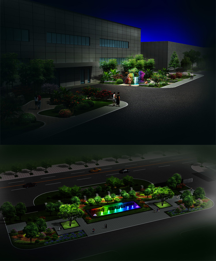 彩虹廠夜景照明設(shè)計,是結(jié)合廣場噴泉景觀,廣場樹木以及草坪的亮化,設(shè)計主要采用彩色燈光和暖色白光為主,中心已白光打亮整個廣場,照明路面,周邊樹木圍欄周圍采用線條燈勾勒出輪廓,在用照樹燈給樹木打亮,是廣場的夜晚更加璀璨。