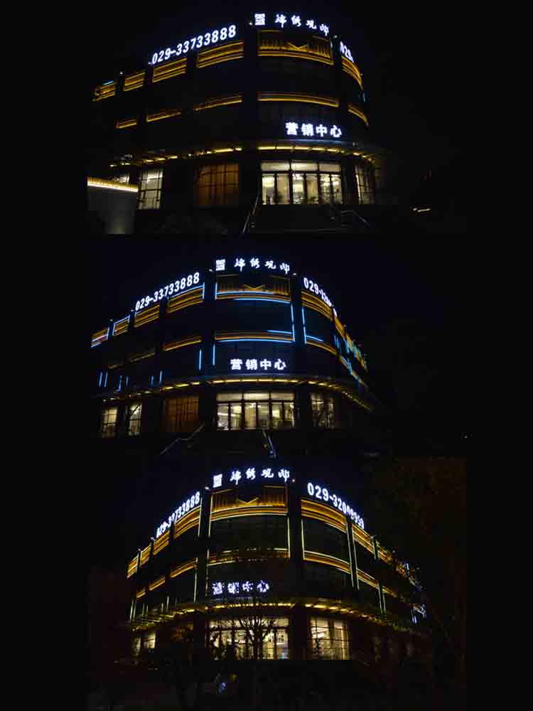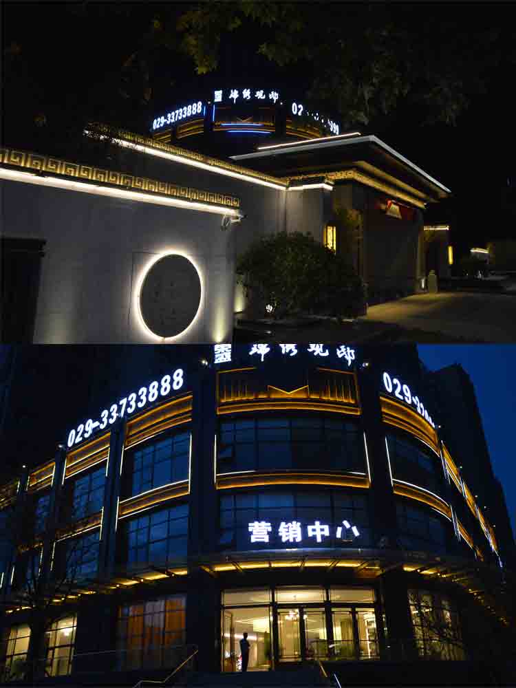 2018 榮盛景秀觀邸售樓部亮化,蘭光設(shè)計師根據(jù)其榮盛景秀觀邸售樓部商業(yè)屬性,商業(yè)照明設(shè)計明亮而醒目,營造商業(yè)經(jīng)營的夜景氛圍。以靜態(tài)的暖色燈光將其打亮,凸顯雅致。“榮盛景秀觀邸”標(biāo)志以高亮度的燈光,吸引顧客注意,增強商業(yè)宣傳力度。景觀燈造型與建筑外立面造型完美融合,晚上光斑效果與綠植景觀交相輝映,相映成趣!榮盛景秀觀邸的亮化設(shè)計施工,獲得了客戶的高度認可。